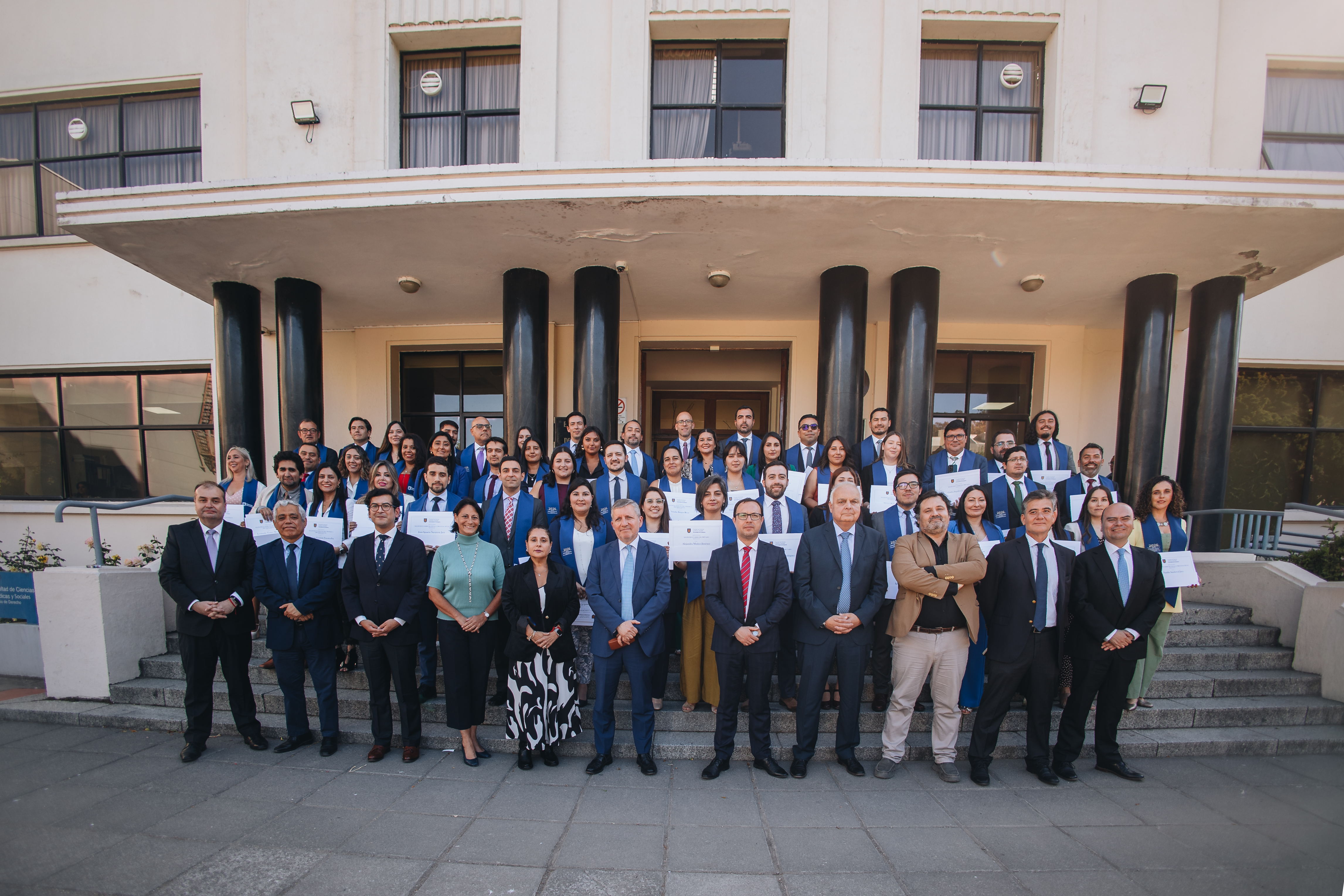 El encuentro finalizó con una fotografía oficial en el frontis de la Facultad, momento que reunió a las y los graduados junto a autoridades y académicos, sellando así una jornada de celebración para la comunidad de postgrado de la Facultad de Ciencias Jurídicas y Sociales.