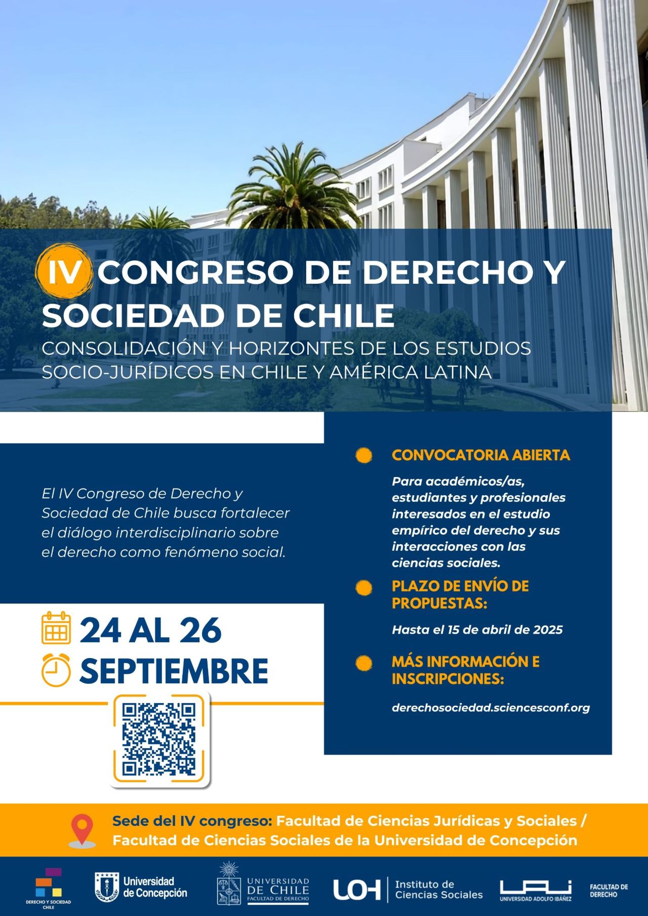 Con el objetivo de afianzar el diálogo interdisciplinario y crítico sobre la legalidad, reforzando los lazos profesionales y epistemológicos entre investigadores e investigadoras a nivel nacional e internacional, el Grupo de Estudios Derecho y Sociedad de Chile, conformado por académicas y académicos de la Universidad de Concepción, Universidad de Chile, Universidad de O'Higgins y de la Universidad Adolfo Ibáñez, han organizado la cuarta versión de su congreso bajo el nombre de Consolidación y horizontes de los estudios socio-jurídicos en Chile y América Latina.