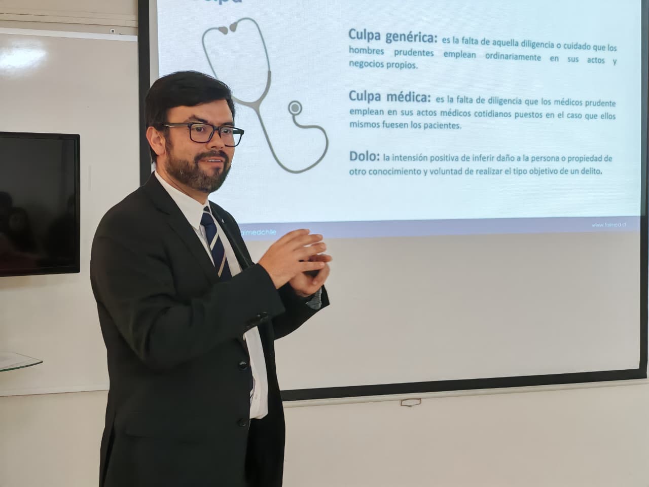 En su ponencia, titulada “Responsabilidad Civil y Penal Médica: Desafíos y Buenas Prácticas”, el profesor Moreno abordó los principales aspectos jurídicos del ejercicio profesional médico, profundizando en conceptos como culpa médica, lex artis, obligación de medios, judicialización de la medicina, y entregando recomendaciones prácticas ante eventuales reclamos o procesos judiciales.