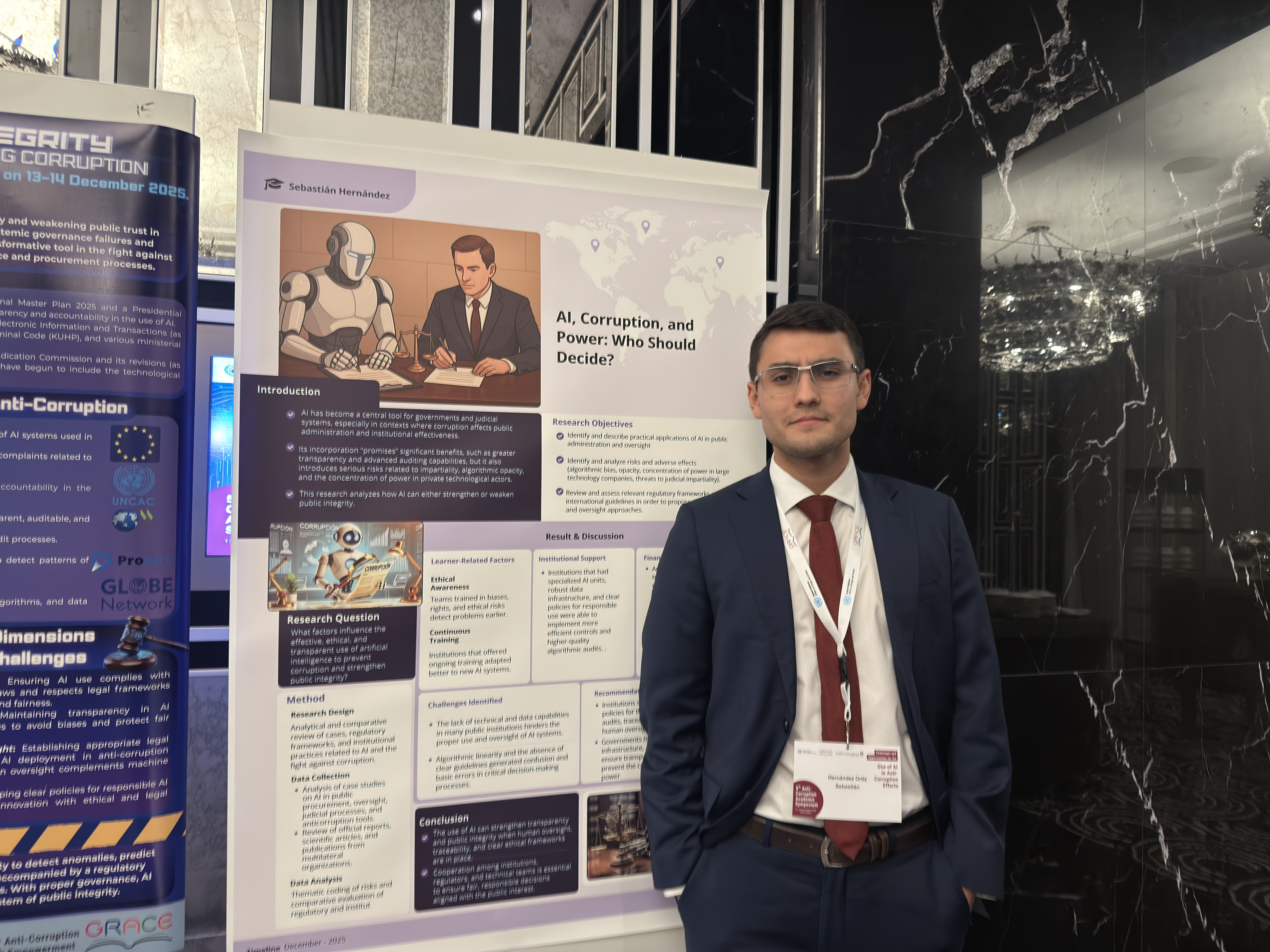 Sebastián Hernández expuso su investigación el sábado 15 de diciembre, a las 17:00 horas (hora local de Qatar), ante una audiencia especializada reunida en el marco del Simposio Académico. En la instancia estuvo presente Bianca Kopp, Oficial de Prevención del Delito de la UNODC y coordinadora de la iniciativa GRACE, así como diversas autoridades y representantes internacionales, entre ellos el representante oficial del Estado de Rusia, Maria Adomeit, Oficial a cargo de la Sección de Apoyo Temático de la División de Corrupción y Delitos Económicos de la UNODC, y Amal Alkuwari, Director del Departamento de Control y Desarrollo de la Autoridad de Control Administrativo y Transparencia del Estado de Qatar, además de otros actores relevantes del ámbito público y multilateral.